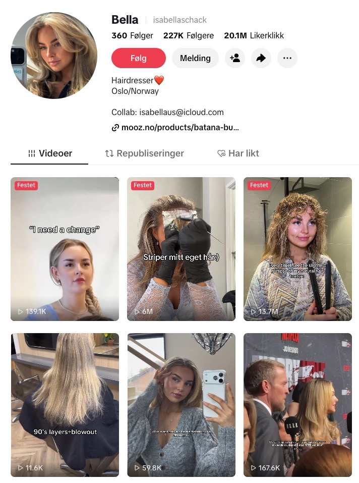 Som yngre ble Isabella inspirert av hårinfluenser Lotte Myrseth, og ble motivert til å skape sitt eget univers på sosiale medier. Hun startet med å filme konsultasjoner med kundene sine i Bergen – og over natten gikk hun viralt. Kontinuitet, volum og læring er nøkkelen. Det handler ikke om å være perfekt, men om å være synlig, ekte og villig til å utvikle seg. Drømmer du om å bli hårinfluenser eller bygge en karriere i sosiale medier som frisør? Da er rådet klart: